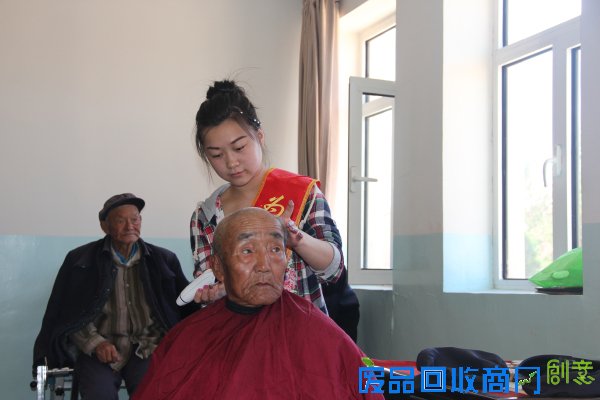 为老志愿者为敬老院的老人理发
