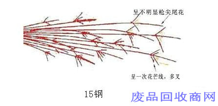 ①、15钢:火花束较长,流线少,芒线稍粗,多为一次花,发光一般,带暗红色,花粉微少。