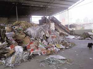 在台州经济开发区界牌菜场附近的废纸打包厂,记者看到,收过来的废纸堆积如山。
