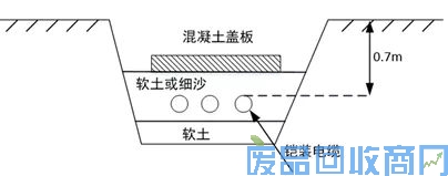 (2)电缆敷设后,上面要铺100mm厚的软土或细沙,再盖上混凝土保护板,覆盖宽度应超过电缆两侧以外各50mm,或用砖代替混凝土保护板。