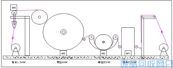例3、 广东大唐印染厂的美国莫里森预缩机,整机的传动流程:进布——橡毯——呢毯——落布。