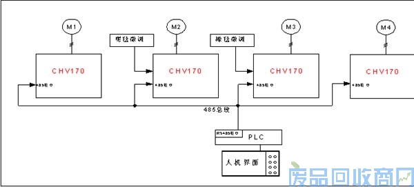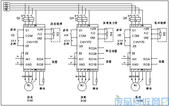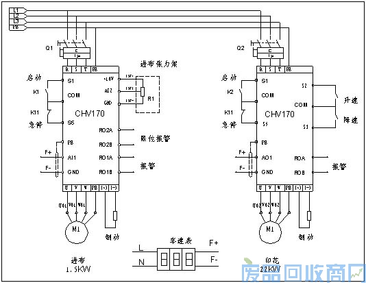 所有同步调速控制都由英威腾CHV170系列张力控制型变频器来完成,材料费节省近2万元(如省掉同步器、电线等材料)。品行简单方便,经济实惠。