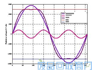 因此可以通过把零序电压信号加进到正弦电压调制波中而不出现过调制的情况(见图4)。即使在正弦电压信号的幅值高于这个电压限制值,零序电压信号也可以迫使调制波幅值低于VDC/2,同时附加产生的谐波电压也可抵消。应该留意到由于系统的对称性在负载线电压上是看不到这个零序电压的,但实际上所有的零序分量谐波电压都会出现在负载星形中点和直流母线中点之间。图(4)显示了这种调制技术,其中零序电压采用三次谐波电压:
