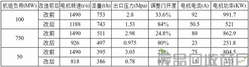 为比较变速调节和传统挡板调节凝聚泵电耗情况,确定其节能效果,于2005年5月17日对#6机组的#1凝聚泵变频装置作了电耗对比试验,机组在100MW、75MW、50MW负荷下运行时,变频调节比传统的挡板调节分别节电470kW、611kW、631kW,节电幅度为47.4%、70.8%、78.4%。变频调节节能效果明显,具体数值见下表: