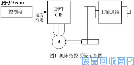 变频器AI1/GND端子提供与数控系统速度模拟量,AI1接数控系统模拟量接口正信号,GND接负信号,信号为0~10V模拟电压信号,控制主轴转速。S1/S2/COM为变频器的正转/反转信号端子,由数控系统发出正转信号或者反转信号,来驱动中间继电器,中间继电器的常开接点接入变频器S1/ S2/ COM,从而控制变频器的正反转。