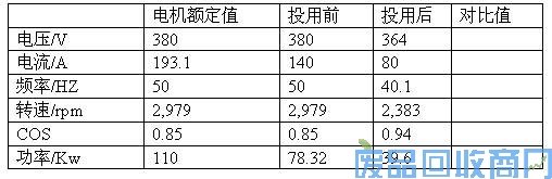 从表中可以看出,使用变频器后功率节省38.72kw,按年运行8000小时计算,每年可节省电能309760kwh,若按电价0.35元/kwh计算,每年节约电费10.8416万元。不到一年可收回投资。