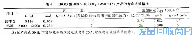 根据以上分析,选择合适的阳极箔和电解纸,浸渍新型的工作电解液,使用新设计的零部件,采用特殊的制造工艺生产的CDC03型400V10000μFφ90×157产品,其试验情况详见表4。