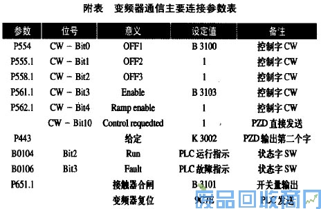 变频器参数设置的基本过程如下:变频器送电后,首先将参数恢复为工厂设置,然后进行CBP板的配置,选择P060=5进行系统设置,最后进行控制字和状态字的连接设置,将矢量控制开关量和矢量控制连接量与PLC中定义的参数值和控制字连接。本系统的主要连接参数如附表所示。