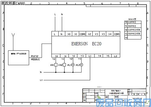 采用一台EC20-1006BRA作简单的继电连锁,除了和旧系统进行连锁(互锁),还有变频器的简单启动和停止及报警。本系统还另外装有一台EC20-1006BRA,通过串口与一台数传电台相通讯(MODBUS),来实现和另外一个水泵房(净环泵房)实现连锁。当璇流井有高液位报警时,通过PLC及数传电台传送到净环泵房,由操作人员确定水泵的启动和停止(由于二者距离太远,且不适合电缆敷设,所以采用无线数传的方式)。 其中璇流井内PLC设置为主站,净环内PLC为从站。数传电台采用深圳科立讯生产的PT6080无线数传电台是利用先进的单片机技术,无线射频技术,数字处理技术设计的功率较大,体积较小的模块式半双工数传电台,采用SMT新工艺,选用高质量的元器件。抗干扰能力强,精致坚固,结构紧凑,安装方便。数话兼容,数传可优先。RS232、RS485及TTL多种接口可供选择,适应面宽。参见下面原理图:
