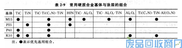 有色金属时宜选用WC-Co合金(K20用得最多)。在高速切削的Al2O3。涂层的基体,选择YG6较好。对于不同的涂层最好使用与其相匹配的基体,加工条件不同,对涂层硬质合金基体的要求也不同。常用硬质合金基体与涂层的组合见表2-9。