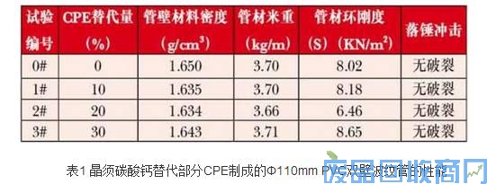 赵学华高工根据在橡胶材料中使用晶须碳酸钙的经验,将特别制造的晶须碳酸钙加以处理,再与基体塑料混合,结果发现,在不影响塑料材料性能的情况下,可使其填充塑料的密度有所下降。同时纳米尺度的微孔还有助于受外力时发生弹性形变,吸收冲击能,有利于填充塑料保持良好的抗冲击性能。以Φ110mm PVC双壁波纹管为例,在其原配方中,用经过特殊处理的晶须碳酸钙代替等量氯化聚乙烯(CPE)冲击改性剂,挤出制得的管材性能见表1。