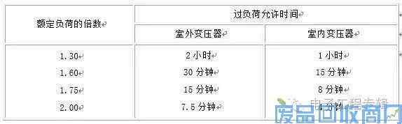 过负荷运行是指变压器运行时超过了铭牌上规定的电流值。过负荷分为正常过负荷和事故过负荷两种,前者是指在正常供电情况下,用户用电量增加而引起的,它往往使变压器温度升高,促使变压器绝缘老化,降低使用寿命,所以不允许变压器过负荷运行。特殊情况下变压器短时间内的过负荷运行,也不能超过额定负荷的30%(冬季),在夏季不得超过15%。对后者,事故过负荷与允许过的时间要求见下表。