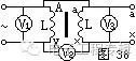 把初级线圈和次级线圈的一对同名端,例如Aa,用导线接起来,如图38所示。然后在AX初级线圈间拉入交流电(比较低的便于测量的)。用电压表分别测量AX间电压V1值,XX间电压V2值,以及ax间电压V3值。如果V2数值是V1与V3电压之差,则Aa是同极性端,如果V2数值是V1与V3电压之和,则AX是同极性端。