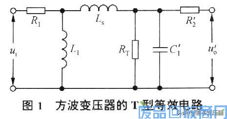 图中ui为初级电压,u'o为输出电压,R1为初级铜阻,Ls为漏感,L1为激磁电感,RT为铁损分量,C'1为分布电容,R'2为次级铜阻。带“'”的参数为折算到初级后的结果。