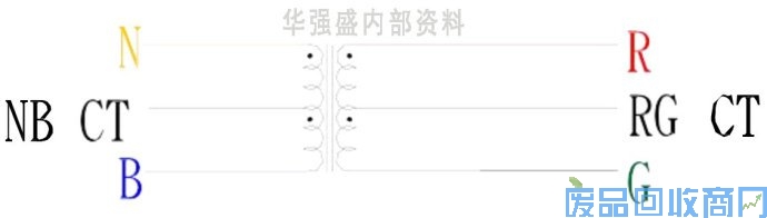 如下图所示变压器的一侧为N&B线(金蓝线);另一侧则为R&G线(红绿线)(NBCT指N&B共同中间抽头;CT:CenterTap)