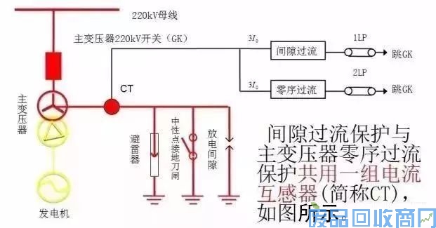变压器出厂时装设了主变压器中性点CT,为降低费用,零序过流采用主变压器自带中性点CT,间隙过流采用单独CT的综合接线。