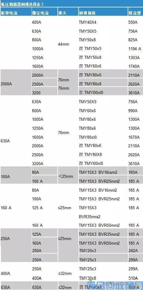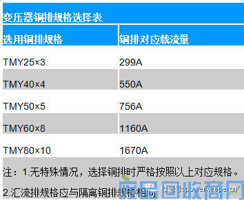 在选择铜排时还应根据板型接头、相间距离等相关尺寸进行选择!(50kVA以下的变压器可以考虑使用电缆,尽量不要使用铜排。)