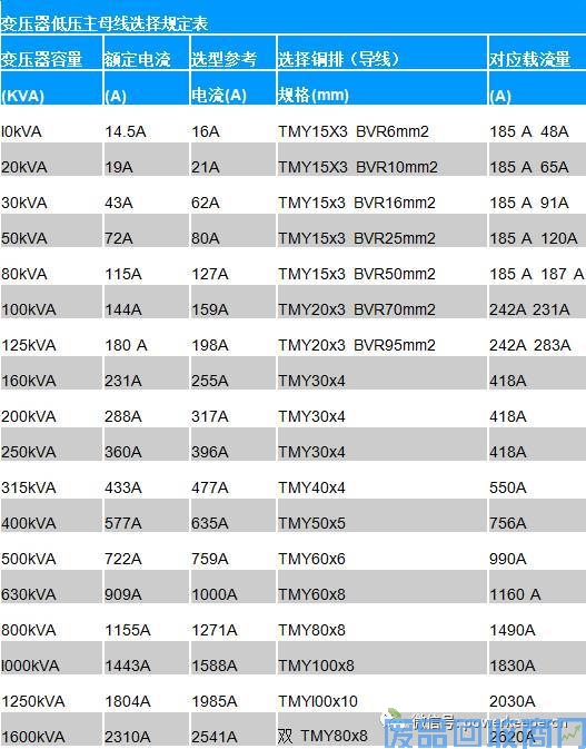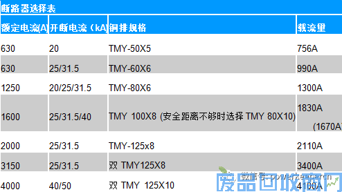 (2)变压器低压主母线选择规定(客户特殊要求除外):