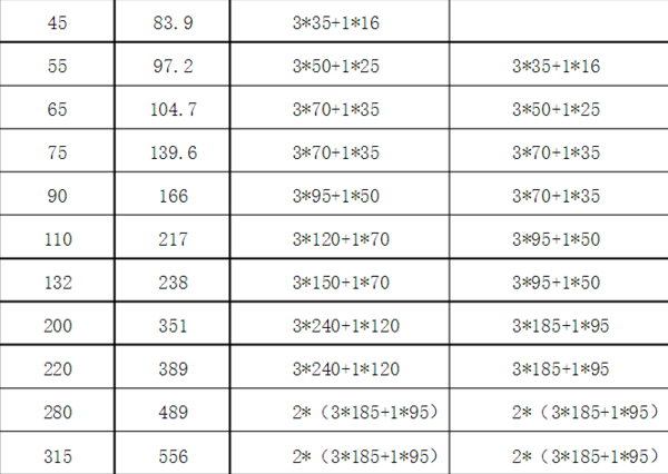 备注:低压电机功率、电流、电缆选型对应表