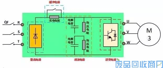 主要由整流桥组成;将交流电(市电)经过全桥整流后成直流电。对于三相380V的交流电,经整流后,直流电压理论值为380X1.414≈537V;而单相220V的交流电,经整流后,直流电压理论值为220X1.414≈310V。