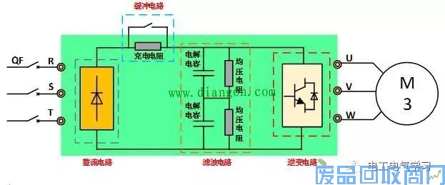 整流电路:主要由整流桥组成;将交流电(市电)经过全桥整流后成直流电。对于三相380V的交流电,经整流后,直流电压理论值为380X1.414≈537V;而单相220V的交流电,经整流后,直流电压理论值为220X1.414≈310V。