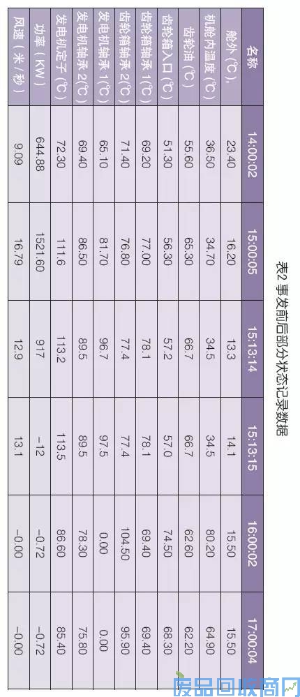 表2 是事故机组的当天14 、15 、16 、17 时的记录数据,以及在事发时15:13:14 和15:13:15 的记录数据,没有记录有事故机组16 、17 时的发电机轴承1 温度和风速数据,其值均为0,可能是因为传感器烧坏,或接线烧断所致。