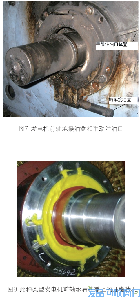 图7 为发电机前轴承接油盒和手动注油口的位置,而自动注油口在发电机轴承前端盖的正上方。按照事故机组发电机轴承的注油和排油方式,只要发电机的润滑泵自动注油正常,在轴承前后端盖之间和整个轴承壳体内部均充满油脂。因此,此种类型发电机轴承的注油量,轴承内部的油脂量就会远超过正常的填充量。图8 为该种类型发电机前轴承后端盖普遍的油脂状况。