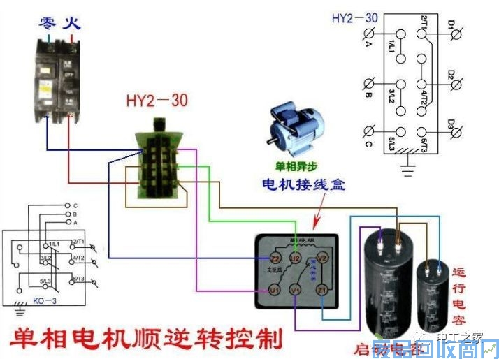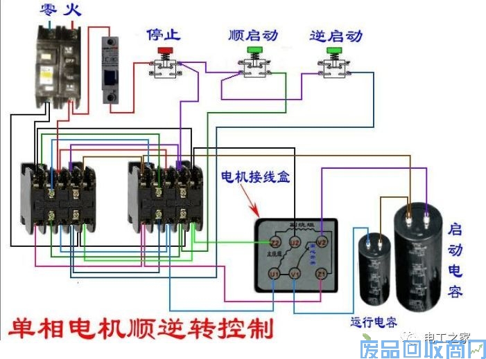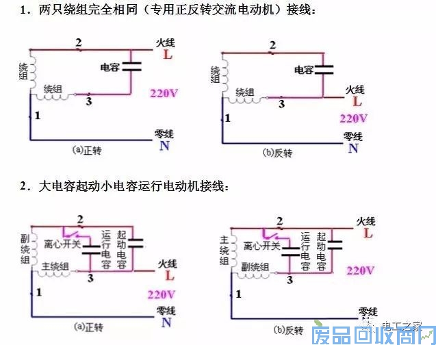 单相电机里面有二组线圈,一组是运转线圈(主线圈),一组是启动线圈(副线圈),大多的电机的启动线圈并不是只启动后就不用了,而是一直工作在电路中的。启动线圈电阻比运转线圈电阻大些,量下就知了。启动的线圈串了电容器的。也就是串了电容器的启动线圈与运转线圈并联,再接到220V电压上,这就是电机的接法。当这个串了电容器的启动线圈与运转线圈并联时,并联的二对接线头的头尾决定了正反转的。比起三相电动机的顺逆转控制,单相电动机要困难得多,一是因为单相电动机有启动电容、运行电容、离心开关等辅助装置,结构复杂;二是因为单相电动机运行绕组和启动绕组不一样,不能互为代用,增加了接线的难度,弄错就可能烧毁电动机。