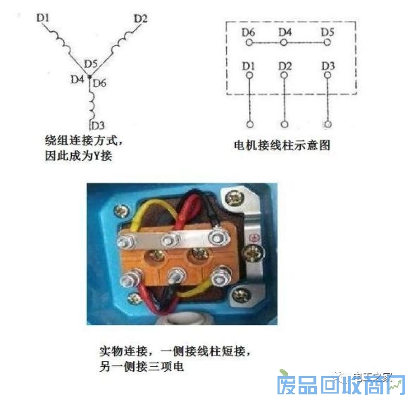 3个接线柱的,是在电机内部已接好成星形或三角形了,出来的就是三根电源线了,采用此法的多是功率较小的电机。只要把380V三相电源线直接接到三柱上就可以了,调换其中两项的位置可以改变电机的转向。