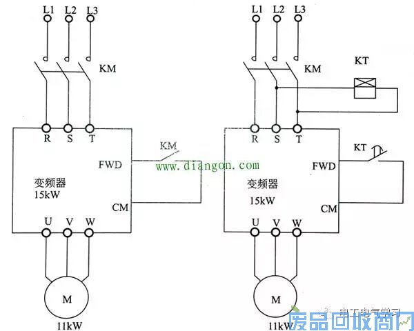 故障处理:按图1B进行改进,增加一只时间继电器KT,用其延时闭合的常开触点,替代图1A中KM的辅助常开触点。这样主回路提前得到电源电压,延时2-3s以后,FWD端子才得到启动信号,保证了变频器的可靠启动。
