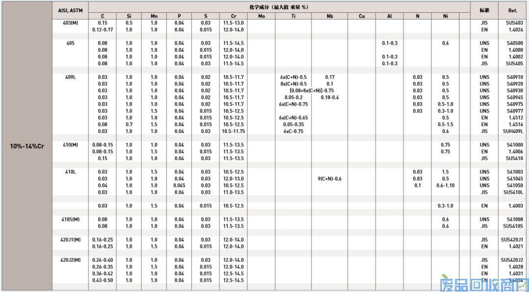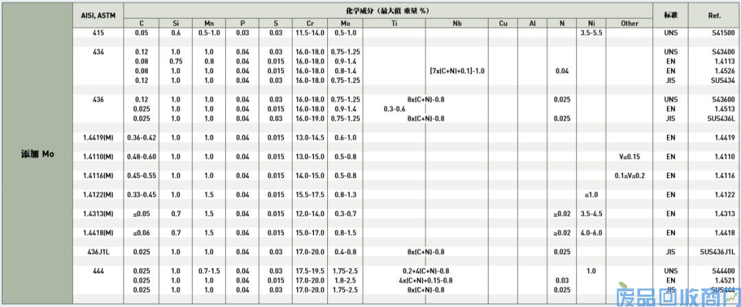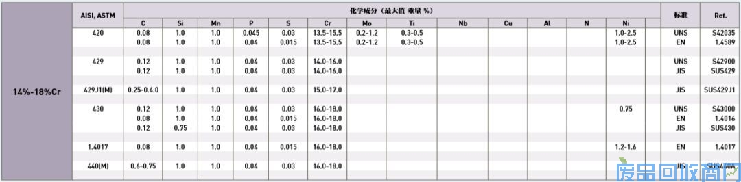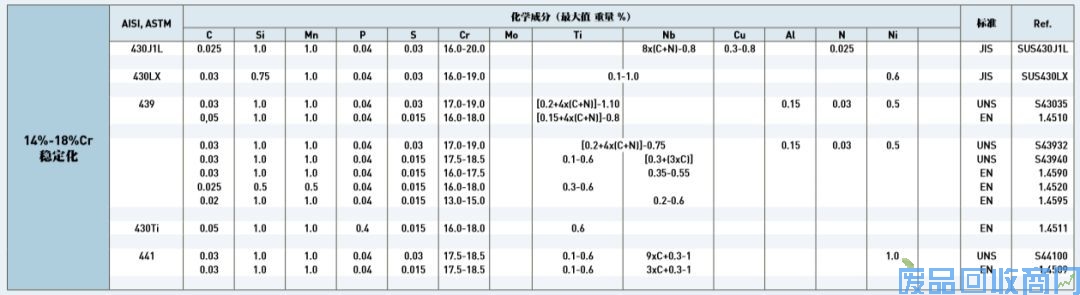 下表给出了 5 大类铁素体不锈钢的化学成分: