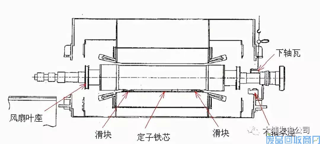 11.继续拉动转子向励端水平滑动,当滑靴抵达定子汽端喇叭口位置时停下。此时应该滑靴在此位置翻转180º(滑动面垂直朝下正对弧形滑板),过程中要防止转子两端晃动,以免转子碰撞定子。