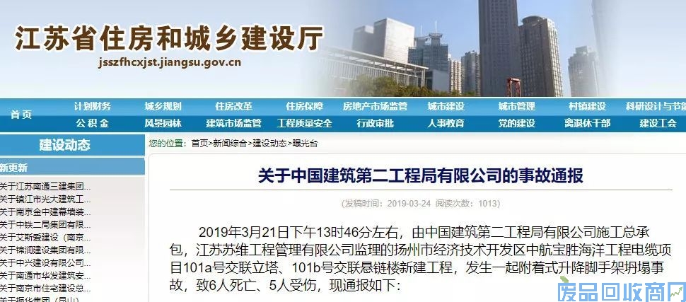 2019年3月21日下午13时46分左右,由中国建筑第二工程局有限公司施工总承包,江苏苏维工程管理有限公司监理的扬州市经济技术开发区中航宝胜海洋工程电缆项目101a号交联立塔、101b号交联悬链楼新建工程工地,发生一起附着式升降脚手架坍塌事故,致6人死亡、5人受伤。