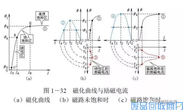 当线圈中通入交变电流时,磁通和电流的波形如图(b)和图(c)所示。图(b)是磁化曲线处于线性段的情形,其特点是:要得到曲线②所示的磁通,只需要很小的励磁电流,(如曲线③所示)就可以了。图(c)是磁路饱和后的情形,其特点是:磁通增加得不多,如曲线④所示,但所需的励磁电流却很大。并且,励磁电流的波形发生了畸变,产生了尖峰电流,如曲线⑤所示。”
