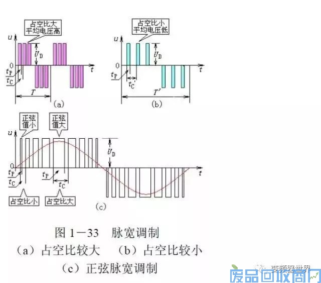 “把变频器的输出电压分成许多个小脉冲,并假设每半个周期中,小脉冲的个数是一定的。那么,当这些小脉冲之间的间隔很小时,总的周期较小,而脉冲的占空比则较大,半个周期中的平均电压也较大,如图(a)所示;
