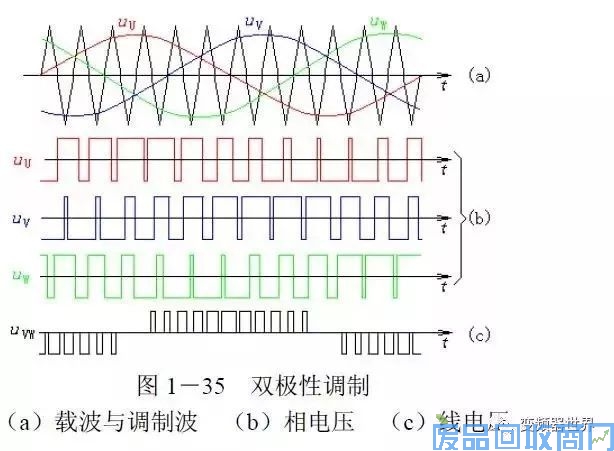 现在的变频器里,单极性调制基本不用。实际用的是双极性调制方式,如图1-35所示。