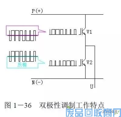 双极性调制的工作特点是,同一桥臂的上下两个逆变管总是交替导通的。就是说,每相脉冲序列的正半周作为V1管的驱动信号,则其负半周经反相后作为V2管的驱动信号,如图1-36所示。”