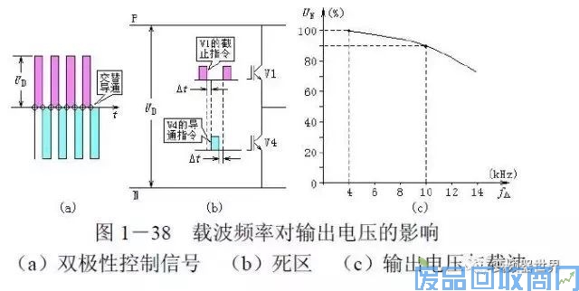 “同一桥臂的上下两个逆变管在交替导通过程中,必须保证原来导通的逆变管(如V1)充分截止后,才允许另一个逆变管(V2)导通。而V1从饱和导通到完全截止之间,是需要‘关断时间’的。因此,在两管交替导通时,需要有一个等待时间,通常称为‘死区’,即图(b)中之δt。死区是不工作的,载波频率较高时,一个周期里死区的个数就多了,则不工作的总时间也多了,变频器的输出电压就要下降了,如图(c)所示。” “啊,”小孙盯着图看,不禁惊呼起来:“载波频率为4kHz时,输出电压还是100%,到10kHz时,电压只有90%了,怪不得电流要增大了。 那么,载波频率对变频器的允许输出电流有影响么?”