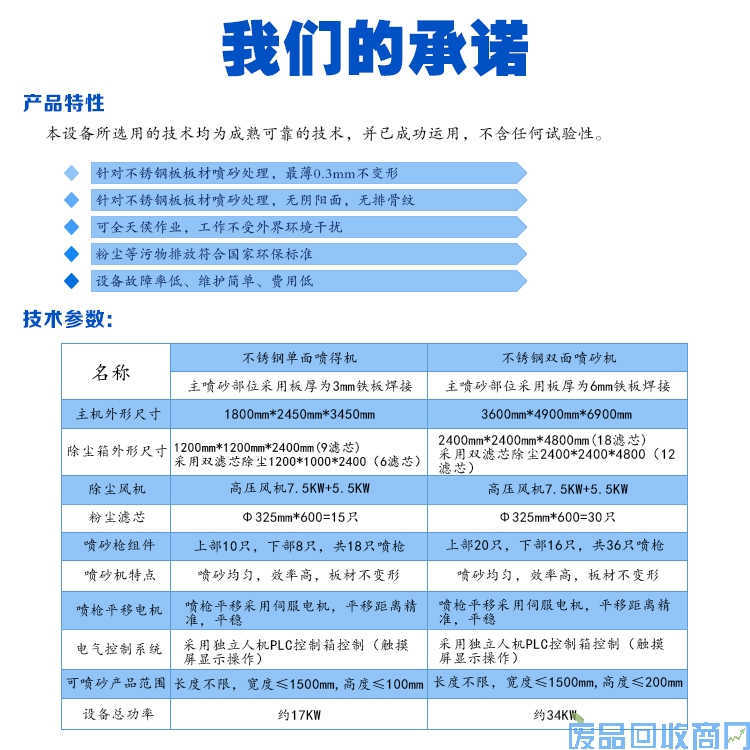 处理宽度为:1500mm、最薄为:0.3mm、长度不受限制的普通不锈钢板材的速工为每分钟0.5-2米包括正反两面,并且表面达到sa2.5级