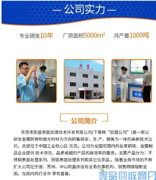 而凯盟公司是国内较先从事不锈钢钝化研究的企业之一,十年余年来对不锈钢钝化液的研究匠心独到、精益求精。目前已与四千多家企业达成合作共识,有完整的技术方案和良好的服务团队,我司前期提供免费试样以及相关技术支持,达到客户满意的效果再谈具体的合作,您可放心购买。东莞市凯盟表面处理技术开发有限公司期待您的来电咨询与洽谈合作,合作共赢是我司秉承的宗旨。