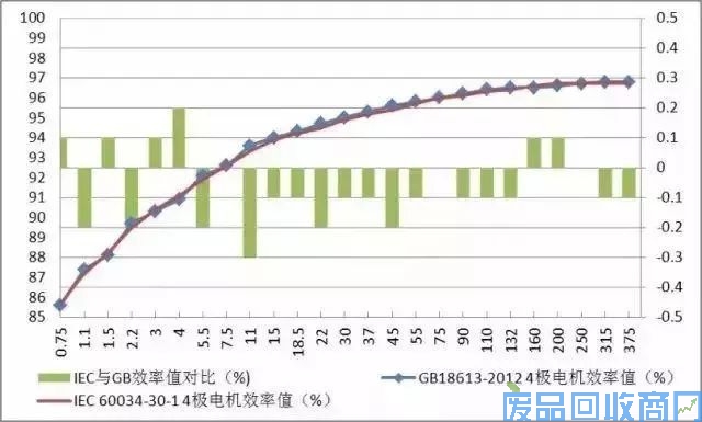 对于额定功率范围为7.5~375kW的电机,其目标能效限定值在GB18613标准实施4年后(也即自2017年9月起)开始正式实施; 对于额定功率为7.5kW以下电机,其目标能效限定值在GB18613-2012标准实施5年后(也即自2018年9月起)开始实施。三、我国与IEC能效标准的对比