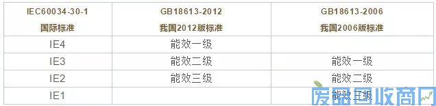 GB 18613中的能效等级分为1级、2级和3级,其中1级效率为最高。国际标准中,能效等级分为IE4、IE3、IE2、IE1四个等级,IE1级为最低,IE4级为最高。