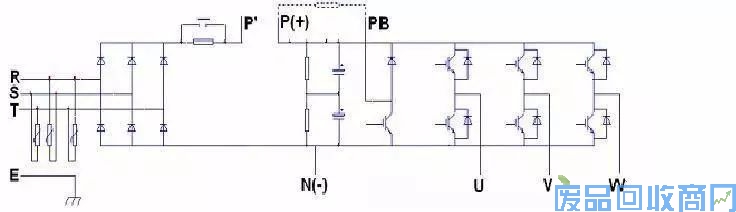 通常的中小容量的变频器主回路器件一般采用集成模块或智能模块。智能模块的内部高度集成了整流模块、逆变模块、各种传感器、保护电路及驱动电路。如三菱公司生产的IPMPM50RSA120,富士公司生产的7MBP50RA060,西门子公司生产的BSM50GD120等,内部集成了整流模块、功率因数校正电路、IGBT逆变模块及各种检测保护功能。模块的典型开关频率为20KHz,保护功能为欠电压、过电压和过热故障时输出故障信号灯。
