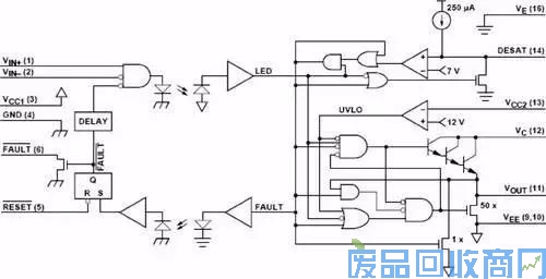 在刚刚上电的过程中,芯片供电电压由0V逐渐上升到最大值。如果此时芯片有输出会造成IGBT门极电压过低,那么它会工作在线性放大区。HCPL316J芯片的欠压锁定保护的功能(UVLO)可以解决此问题。当VCC与VE之间的电压值小于12V时,输出低电平,以防止IGBT工作在线性工作区造成发热过多进而烧毁。示意图详见图1中含UVLO部分。