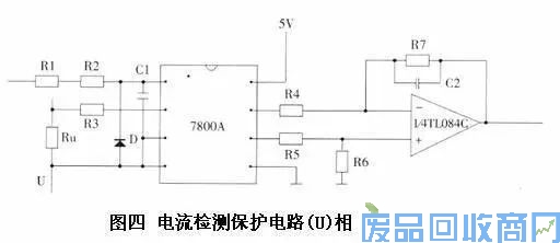 图四所示的电路是较典型的过流检测保护电路。由电流取样、信号隔离放大、信号放大输出三部分组成。