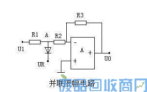 限幅器是一个具有非线性电压传输特性的运放电路。其特点是:当输入信号电压在某一范围时,电路处于线性放大状态,具有恒定的放大倍数,而超出此范围,进入非线性区,放大倍数接近于零或很低。在变频器电路设计中要求也是很高的,要做一个好的变频器维修技术员,了解它也相当重要。 1、 二极管并联限幅器电路图如下所示: