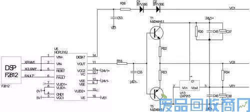 整个电路板的作用相当于一个光耦隔离放大电路。它的核心部分是芯片HCPL-316J,其中由控制器(DSP-TMS320F2812)产生XPWM1及XCLEAR*信号输出给HCPL-316J,同时HCPL-316J产生的IGBT故障信号FAULT*给控制器。同时在芯片的输出端接了由NPN和PNP组成的推挽式输出电路,目的是为了提高输出电流能力,匹配IGBT驱动要求。