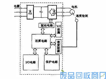 如下图所示,控制电路由以下电路组成:频率、电压的运算电路、主电路的电压、电流检测电路、电动机的速度检测电路、将运算电路的控制信号进行放大的驱动电路,以及逆变器和电动机的保护电路。