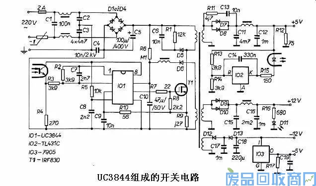 变频器开关电源电路, 变频器开关电源主要包括输入电网滤波器、输入整流滤波器、变换器、输出整流滤波器、控制电路、保护电路。我们公司产品开关电源电路如下图,是由UC3844组成的开关电路:开关电源主要有以下特点: 1,体积小,重量轻:由于没有工频变频器,所以体积和重量吸有线性电源的20~30% 2,功耗小,效率高:功率晶体管工作在开关状态,所以晶体管的上功耗小,转化效率高,一般为60~70%,而线性电源只有30~40%