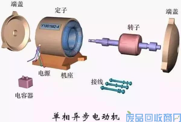 电机主要部件包括:1、机座;2、铁心;3、绕组;4、端盖;5、轴承;6、离心开关或起动继电器和PTC起动器;7、铭牌。